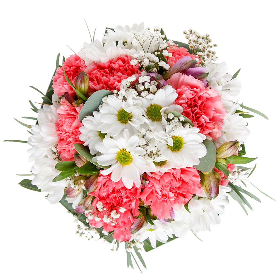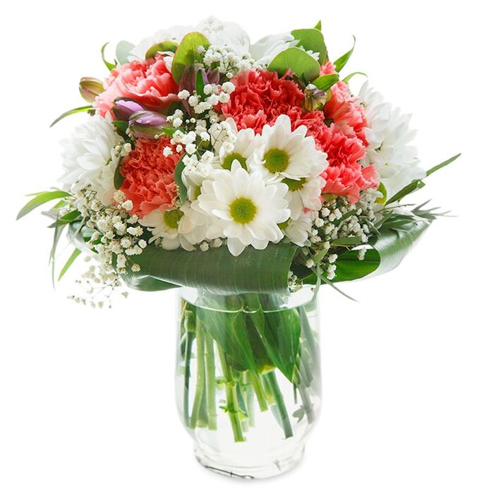 Celebrate special moments with our delicate white charm bouquet, designed to enchant and impress. This arrangement features a beautiful mix of snow-white chrysanthemums, light gypsophila, elegant light pink carnations, and sturdy aspidistra leaves.